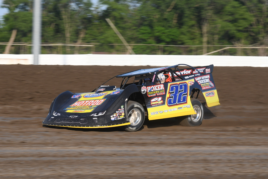 Chris Simpson mashes the gas during a DIRTcar Summer Nationals stop to Davenport (IA) Speedway in July 2021 - Todd Healy Photo